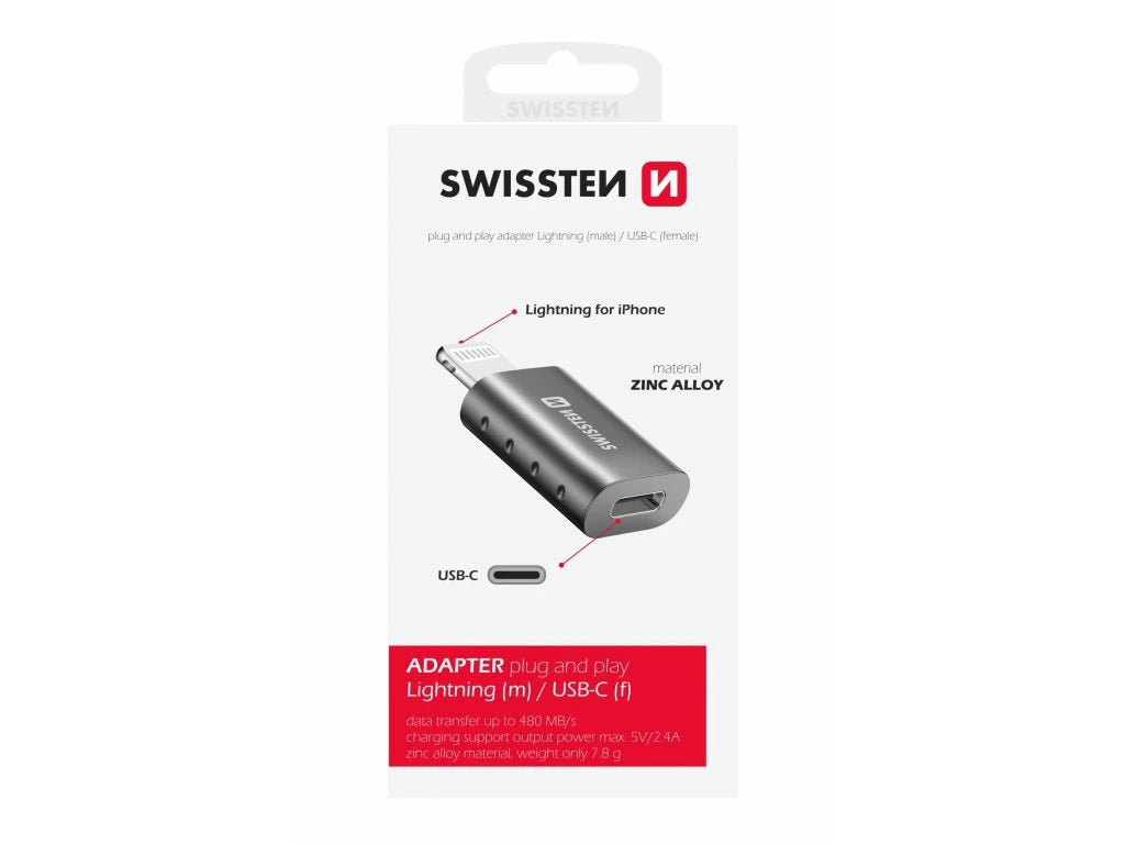 Swissten Lightning til USB‑C adapter Gør hverdagen lettere med en smart adapter, der forbinder dine Lightning‑hovedtelefoner eller enheder med USB‑C porte. Understøtter opladning op til 2,4A/5V og dataoverførsel via USB 2.0 med hastigheder op til 480 Mb/s. Det robuste zinkhus sikrer lang holdbarhed, og med en vægt på kun 7,8 g er den nem at have med overalt. Leveres i Swissten blisterpakke.