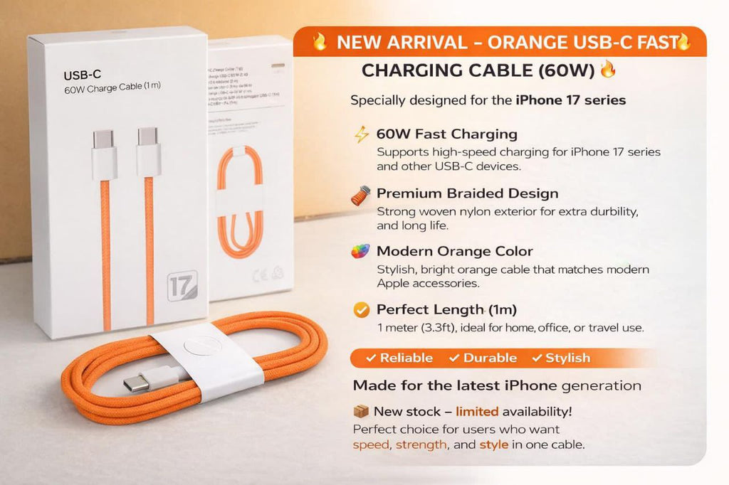 60W USB‑C til USB‑C Kabel (1m) – Kompatibel med iPhone 17-serien Et hurtigt og stabilt opladningskabel til daglig brug. Understøtter op til 60W hurtigopladning og sikker dataoverførsel. Det slidstærke design modstår bøjning og dagligt brug, hvilket gør det ideelt til hjemmet, arbejdet eller på farten. Fuldt kompatibelt med iPhone 17-serien og andre USB‑C enheder
