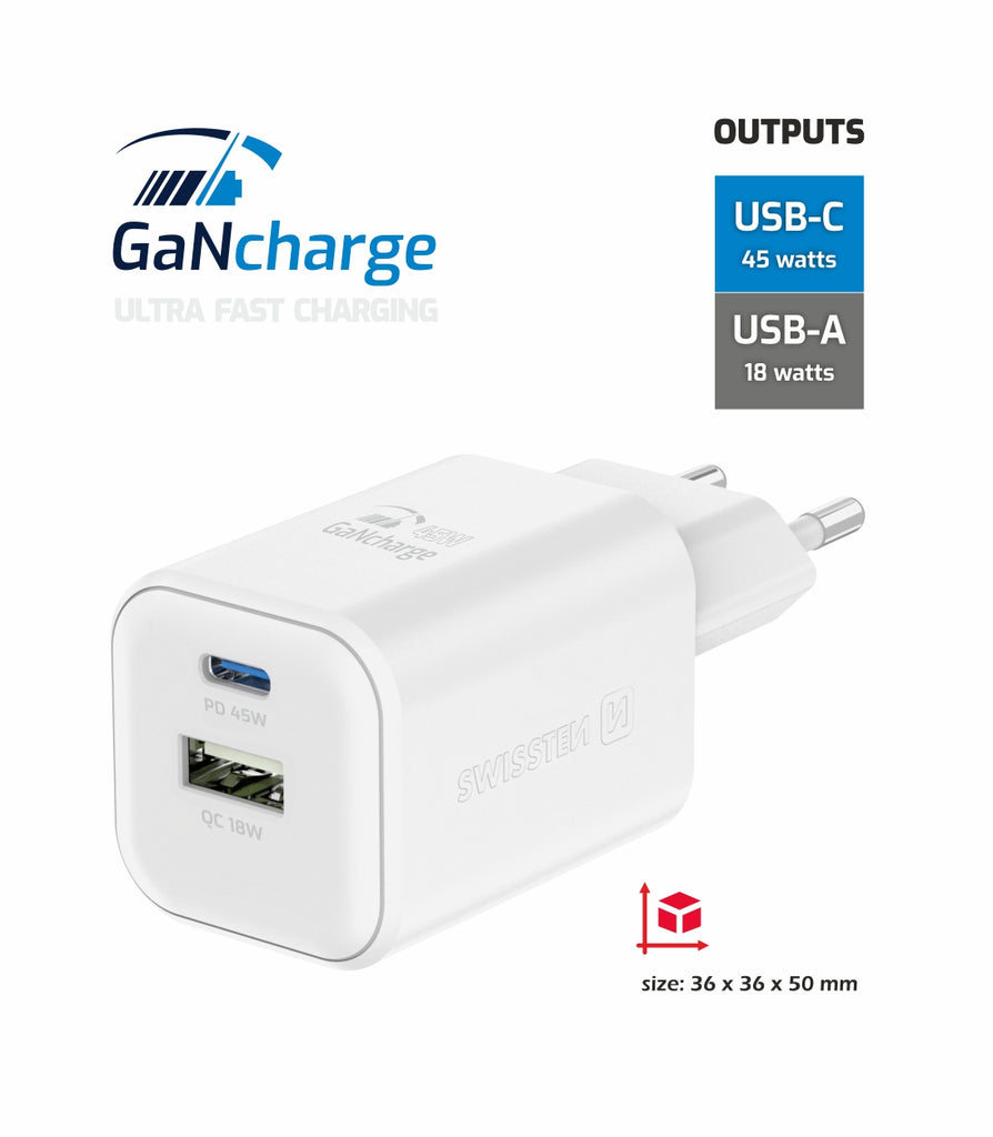 SWISSTEN CHARGER GaN 1x USB-C 45W PD + 1x USB-A 18W QC WHITE